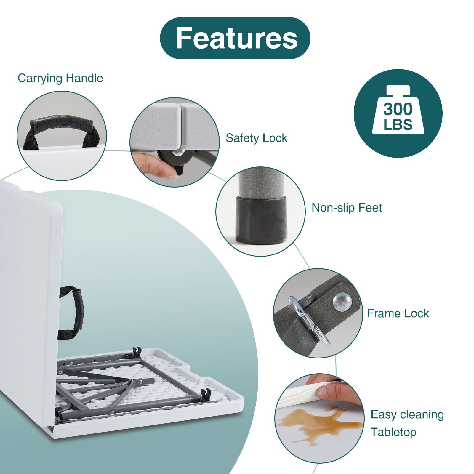 Sturdy&Stable - Featuring steel legs with a grey powder coated finish, our folding table not only looks sleek but also provides sturdy support. With non-slip feet and a frame lock, this table provides stable support for various activities.