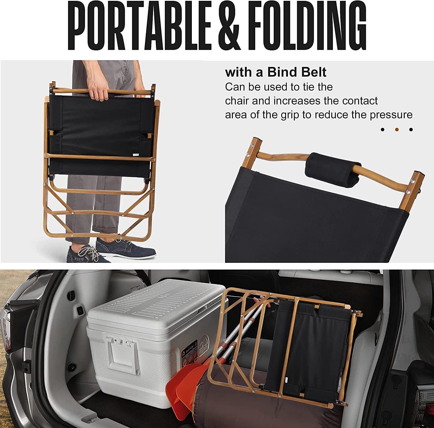 There is a multi-functional back pocket; you can store magazines or articles of daily use and to be carried at any time; practical and convenient.Our collapsible chair can be folded to 24.8" x 20.8" x 2.8"; easy to storage.Stored behind the door; in the corner; under the bed; also in the truck for outdoor use.Wood grain aluminum bracket; weight: 5.7LBS; with a bind belt can be used to tie the chair and increases the contact area of the grip to reduce the pressure.The seat is made of high density 600D Oxford Cloth; which is wear resistant and breathable; can support 265lbs(120kg). The bottom of the frame has 4 triangular structure to reinforce; more stable and safer.Set of 2; Size: 20.8" x 17.7" x 26.4". You can use this folding chair for both outdoor and indoor. Such as camping; fishing; BBQ; garden; lawns; park; music festival and anywhere you need.