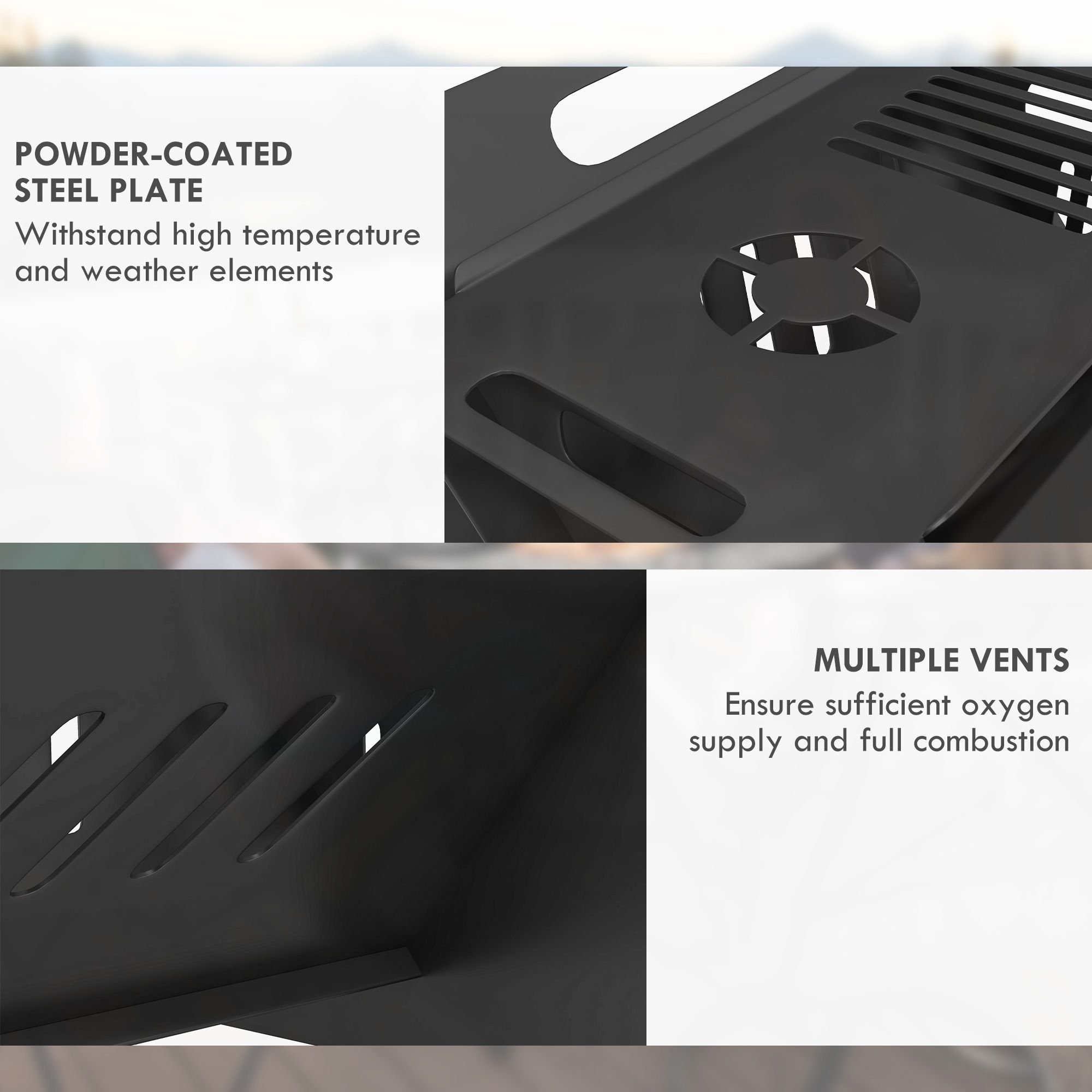 Built for Burning: The steel surface of this camping fire pit has been treated with a water and high-temperature-resistant powder coating. Vents on the bottom and side panels ensure full exposure to oxygen for combustion.