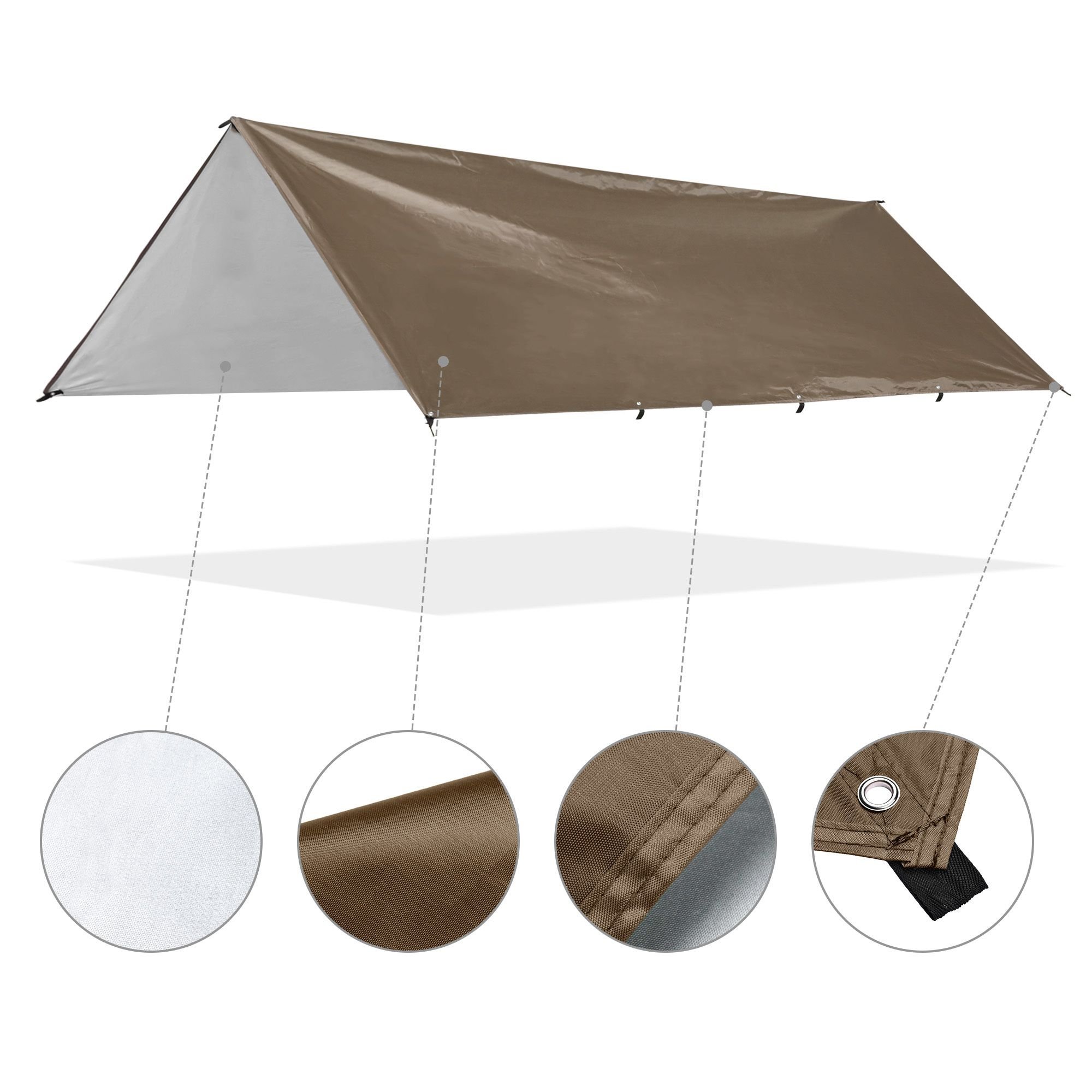 - UV Protection & Water Resistance - Made of 210D oxford fabric with silver PA coating; the tarp offers UV50+ protection for protecting you from sunlight; avoiding sunburn and reducing temperature in hot summer; shelter with PU3000mm water resistance is suitable for using on drizzling days; durable material ensures wear resistance and tear resistance for frequent use