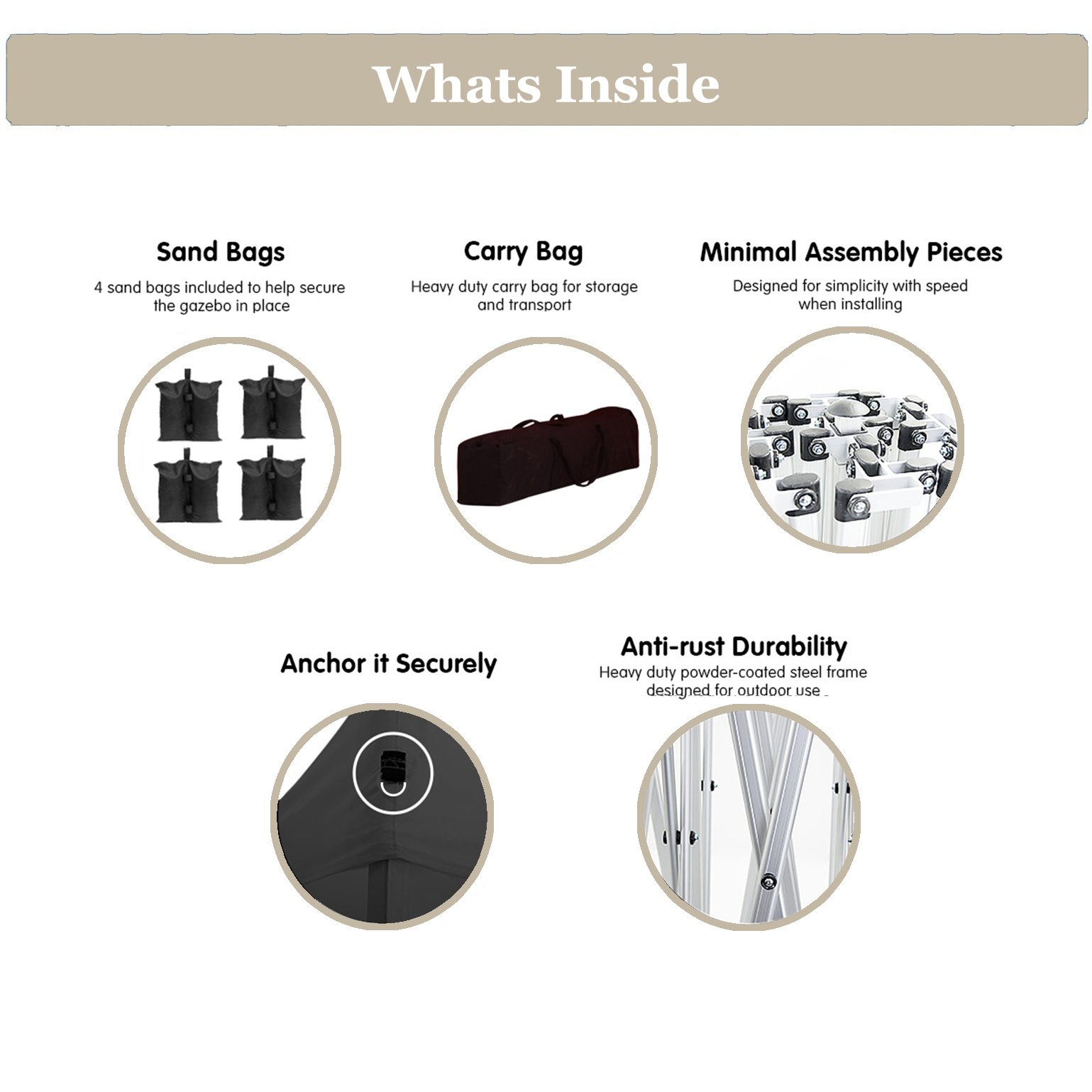 Please make sure all the connections are tight before use. If you want to move the tent already installed, please move the four sides at the same time. Please get the ropes tied and use tent peg to get it fixed. Don't use it on windy or rainy days.