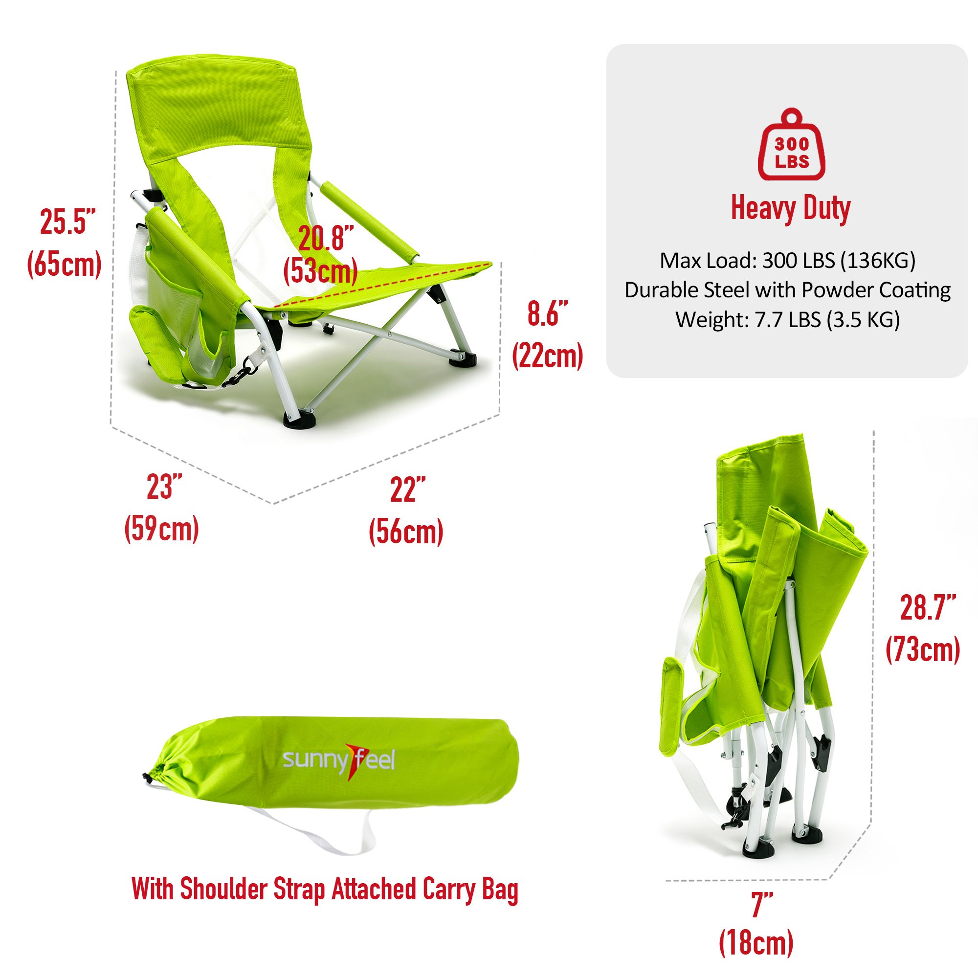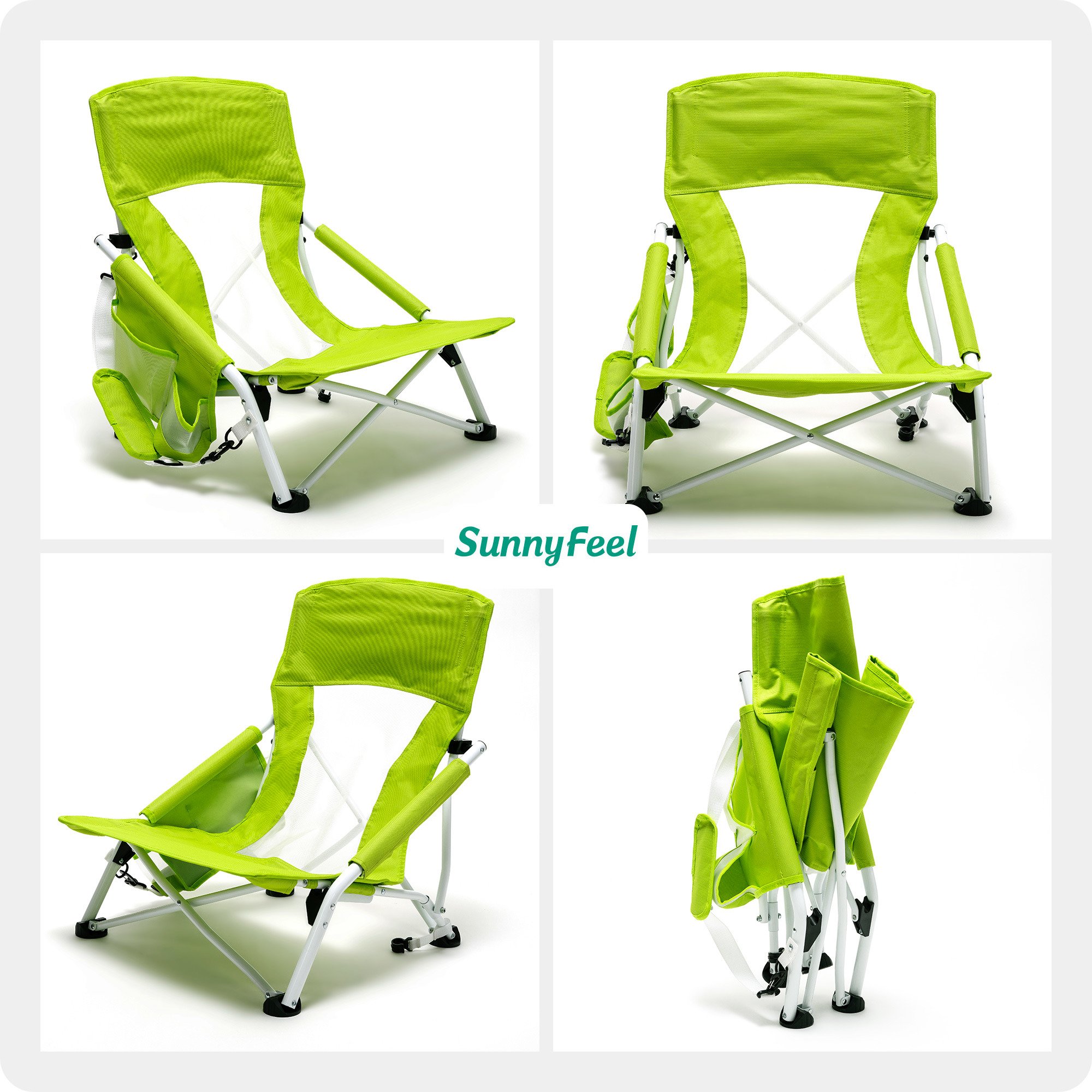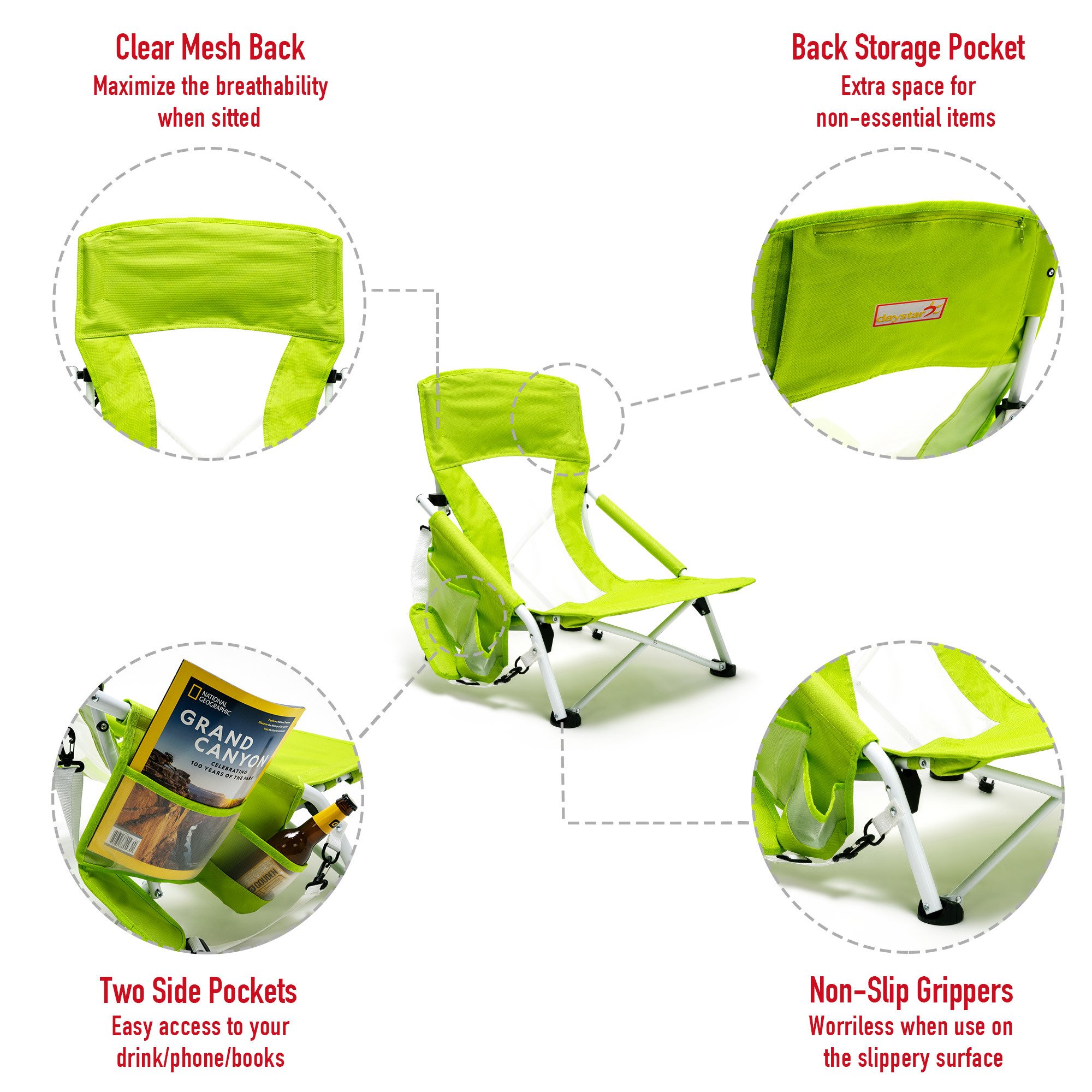 Extremely Comfy & Space Saving: The low seat beach chair seat & anti-sink leg cap & armrest design provide you an ultimate soft seating experience.The breathable and cooling mesh back design makes sitting for long comfortable for you. The small folding size (29×7.5×7 inches) saves your room while not on duty.