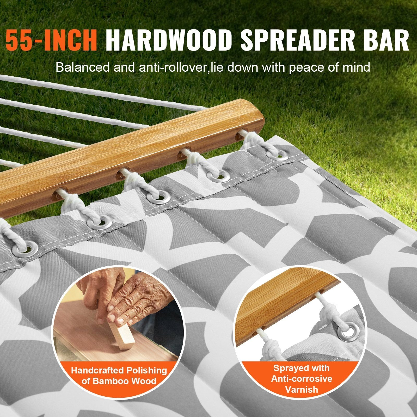Indulge in outdoor relaxation with VEVOR double quilted fabric hammock. Crafted for lasting comfort and reliability, our hammock features 200g quilted cotton and reinforced ends. Supported by hardwood spreader bars, handwoven ropes, 480lbs weight capacity, it offers long-lasting outdoor fun.