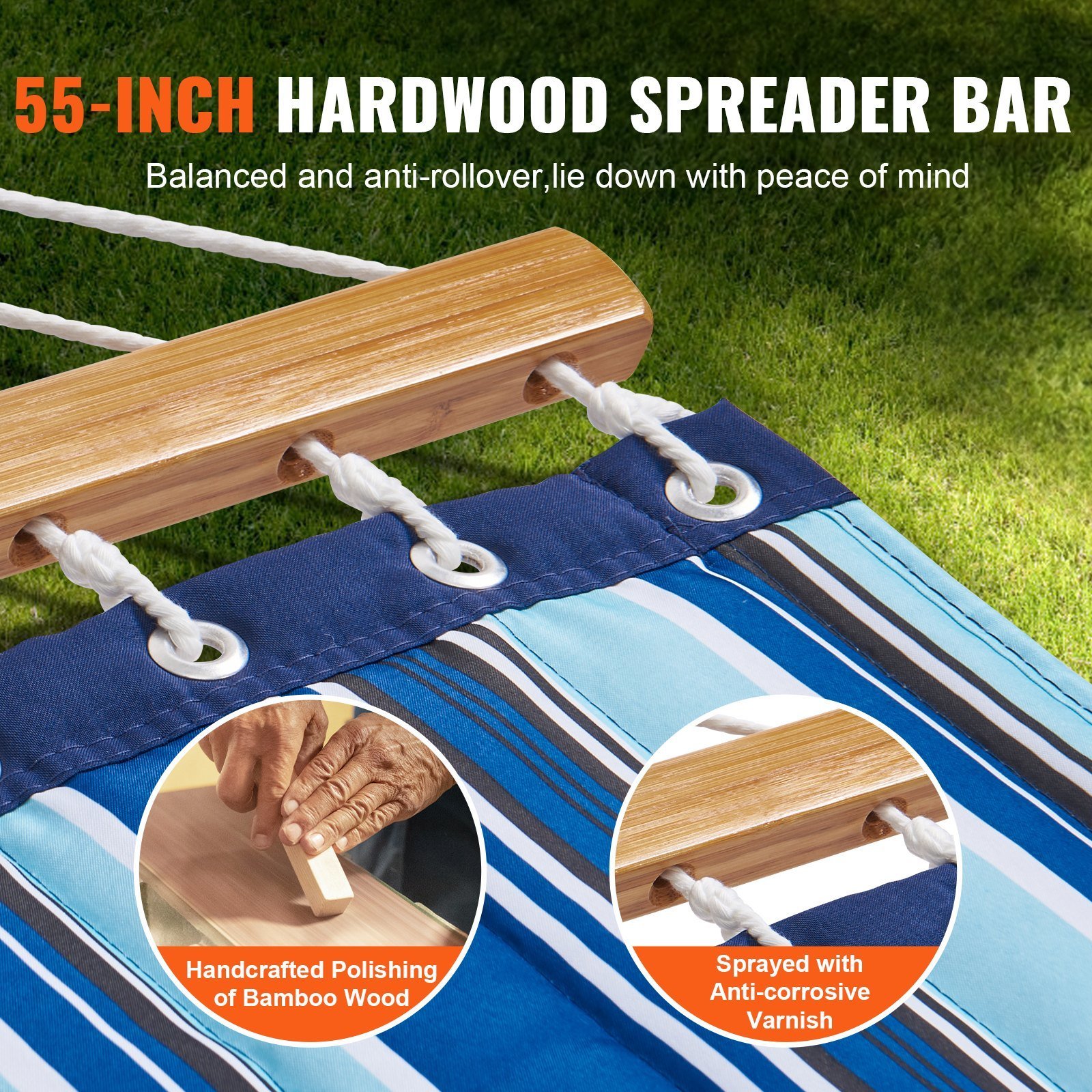 Indulge in outdoor relaxation with VEVOR double quilted fabric hammock. Crafted for lasting comfort and reliability, our hammock features 200g quilted cotton and reinforced ends. Supported by hardwood spreader bars, handwoven ropes, 480lbs weight capacity, it offers long-lasting outdoor fun.