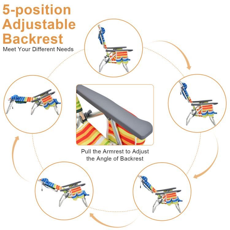 1.5-position Recline Options: The design of this beach folding chair with 5 inclination angles will bring you a different experience to meet your different needs. This beach folding chair has a locking bracket to prevent the beach chair from suddenly tilting or folding, thus you can use it with confidence.