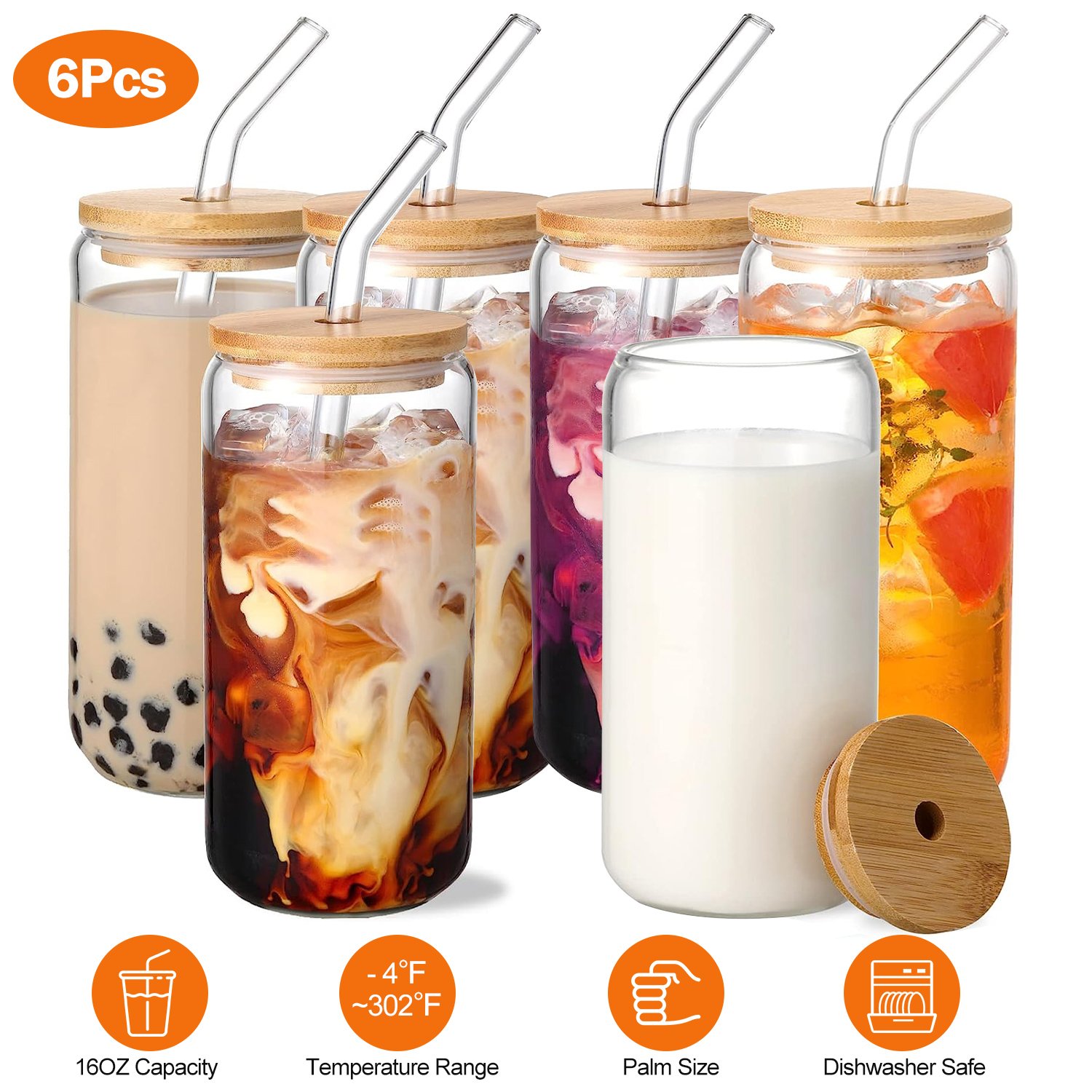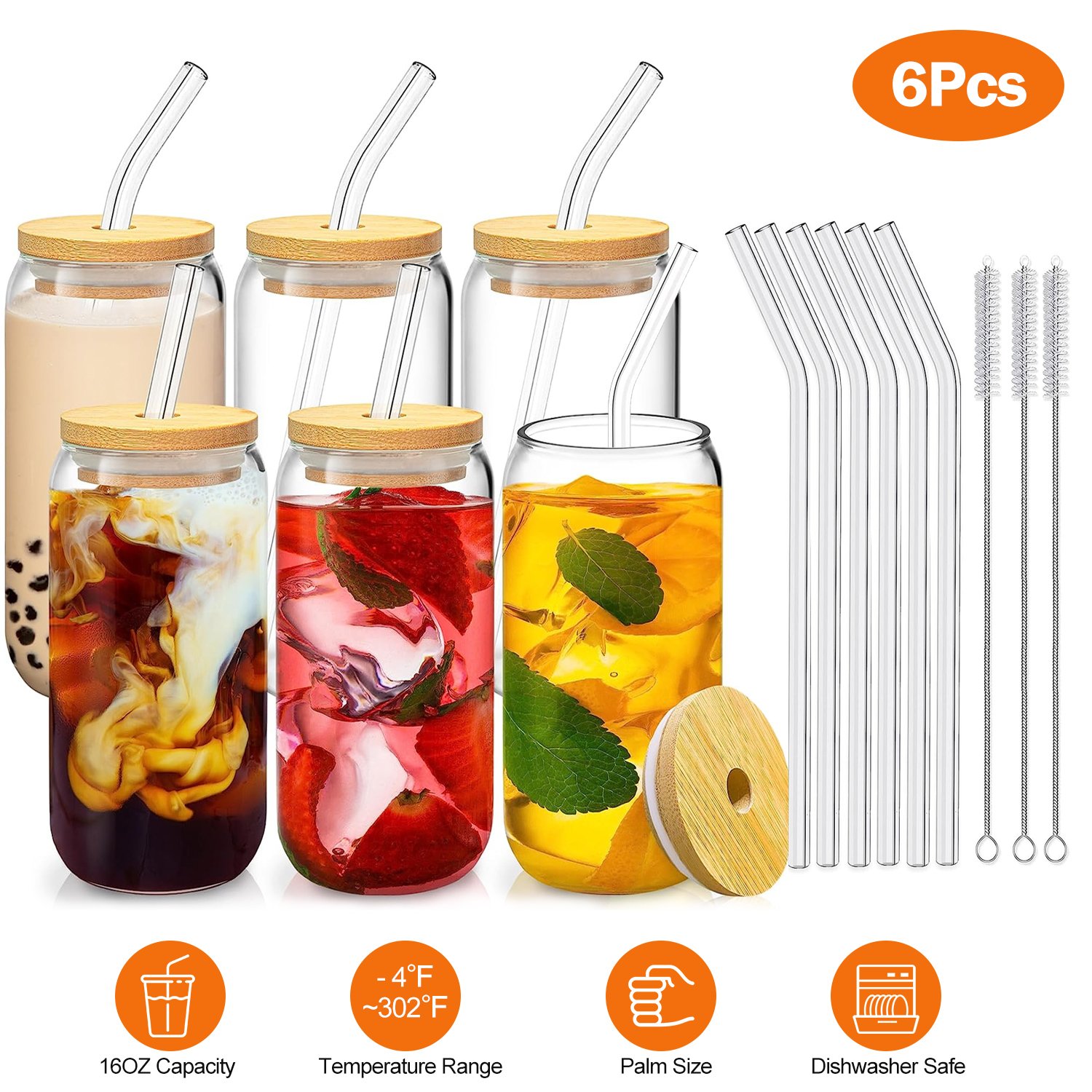 Home > 6Pcs Mason Jar Cups with Lid 16OZ Reusable Glass Beer Can with Bamboo Lids Glass Straws Cleaning Brush for Iced Coffee Smoothie Tea