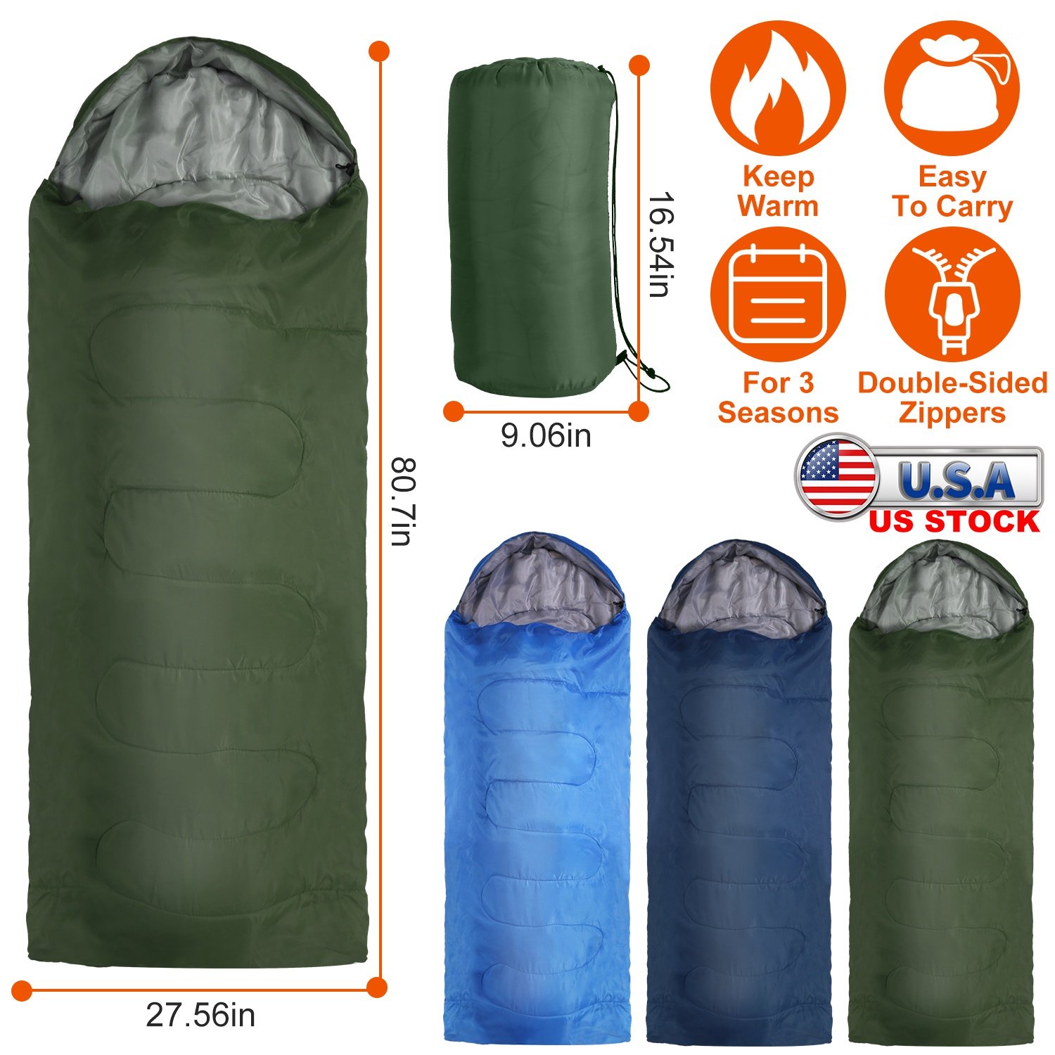Our sleeping bags are designed to provide you a warm and cozy sleep in cold damp night after a tiring day of outdoor exploration. Its comfortable temperature is at 50℉, great for 3 seasons use(Spring, Autumn, Winter). Made of 170 polyester lining and filled with soft hollow cotton, the sleeping bag is warm and lightweight. Included carry bag makes it quite convenient to store and carry. No more lugging around excessive weight in your backpack. After unzip the sleeping bag, you can also use it as a large quilt or mat. Perfect for hiking, camping, mountaining, etc.. Besides, sleeping bag of navy blue, army green and royal blue are provided for you to choose.