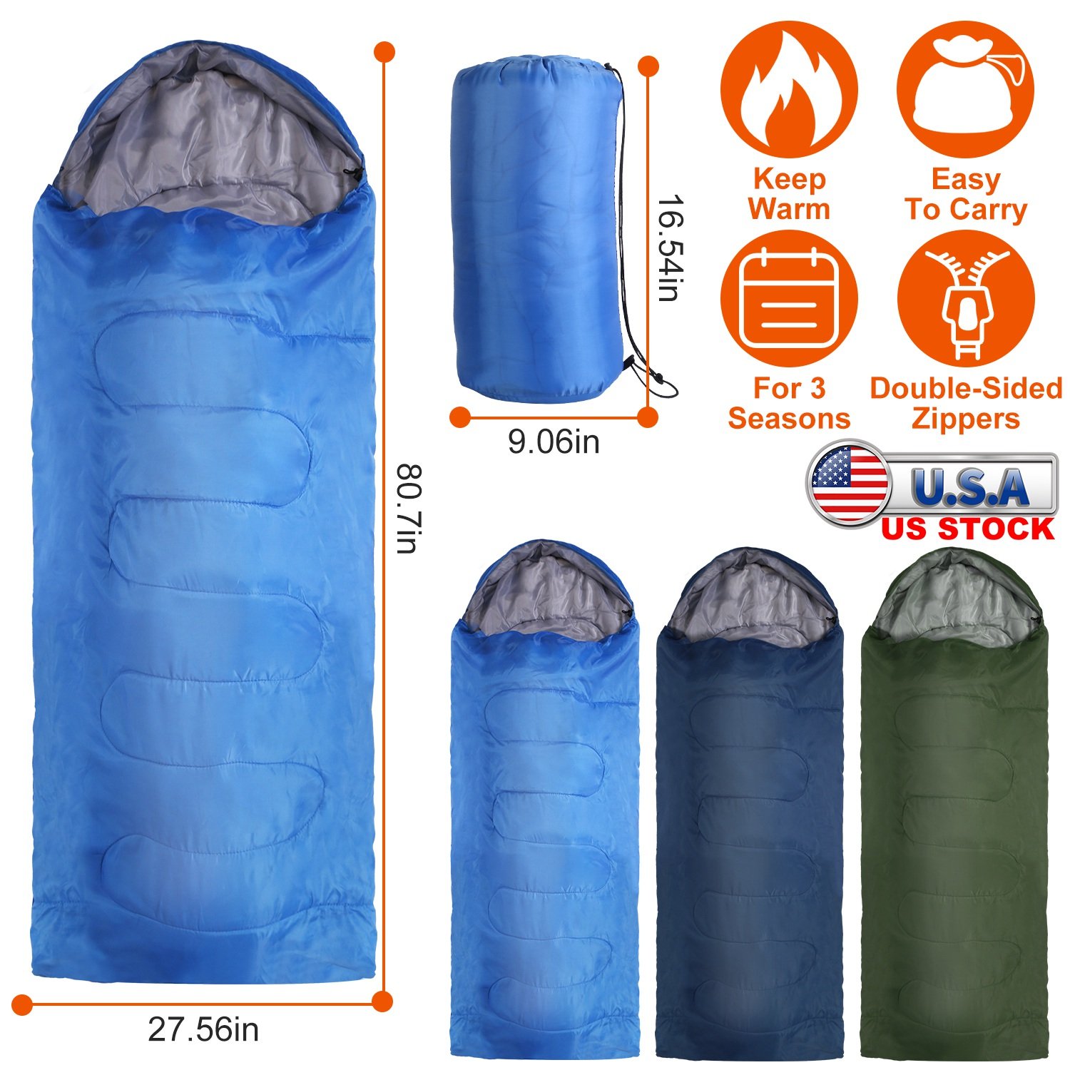 Our sleeping bags are designed to provide you a warm and cozy sleep in cold damp night after a tiring day of outdoor exploration. Its comfortable temperature is at 50℉, great for 3 seasons use(Spring, Autumn, Winter). Made of 170 polyester lining and filled with soft hollow cotton, the sleeping bag is warm and lightweight. Included carry bag makes it quite convenient to store and carry. No more lugging around excessive weight in your backpack. After unzip the sleeping bag, you can also use it as a large quilt or mat. Perfect for hiking, camping, mountaining, etc.. Besides, sleeping bag of navy blue, army green and royal blue are provided for you to choose.