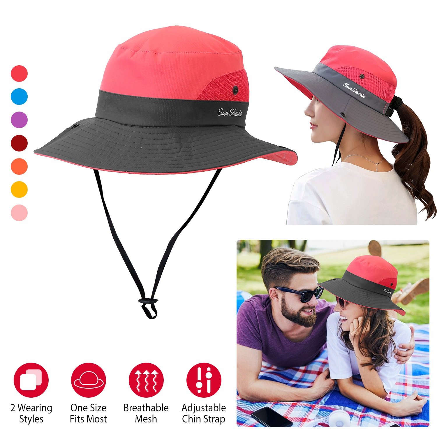 Women Summer Sun Bucket Hats Foldable UV Protection Cotton Cap Wide Brim Floppy Cap Packable Ponytail Mesh Travel Hat For Beach Fishing Camping Travel