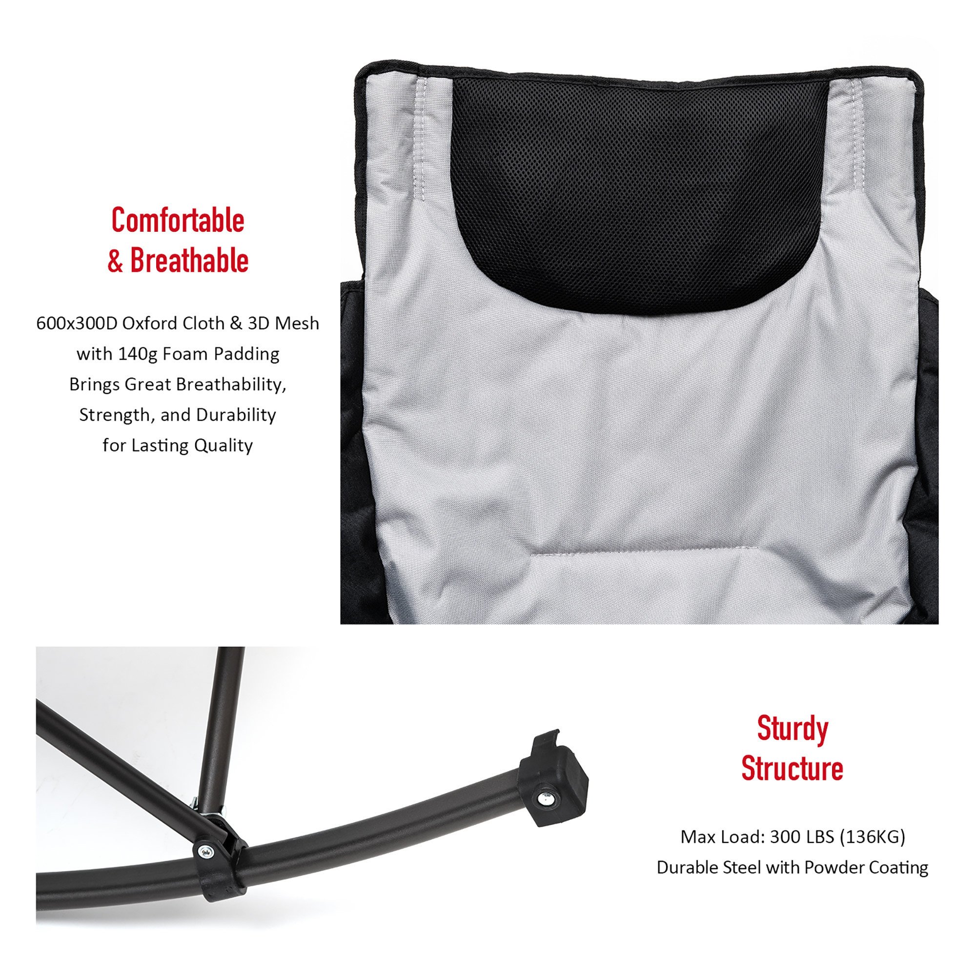 Extremely Comfy & Space Saving: The fully padded and comfy cushioned armrest, high back and comfy rocking camp chair seat provide you a comfortable seating experience. The smooth-rocking design helps you to relax and enjoy the breeze during your journey. The small folding size (43×9×7 inches) saves your room while not on duty.
